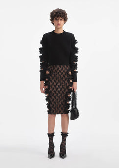 All eyes will be on you in this bodycon lace skirt, courtesy of the ruffle outlined cut-outs down the sides. Add a dash of daring and wear with a t-shirt and heels for an effortless party look.
