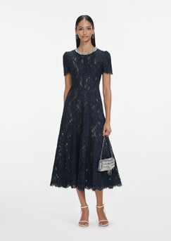 Navy Lace Embellished Midi Dress-BLUE