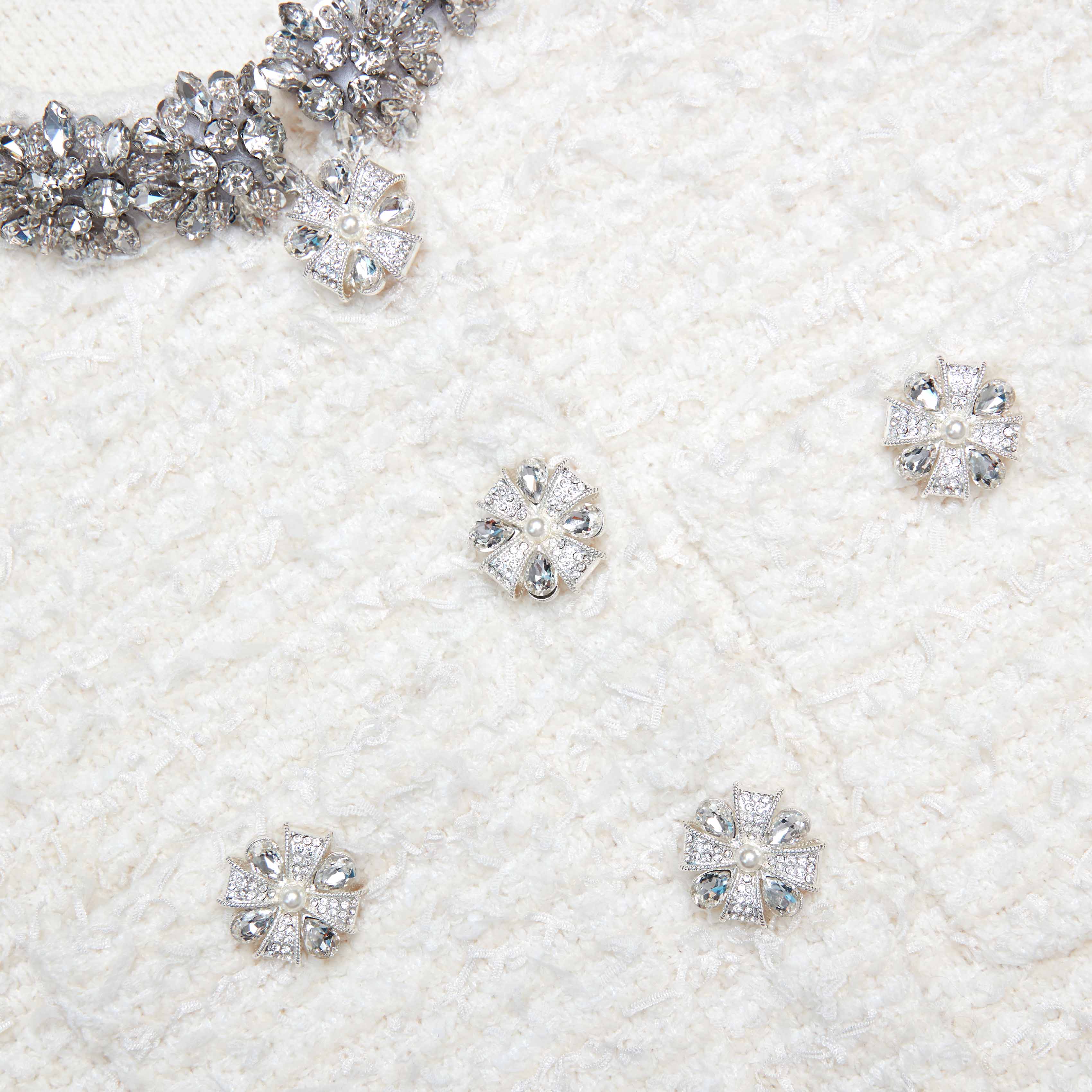 Clean lines and a sleek fit give this cream bouclé knit dress a polished look, whilst silver & diamanté buttons and trims add to its party-ready appeal. Style it with heels for a chic night out.