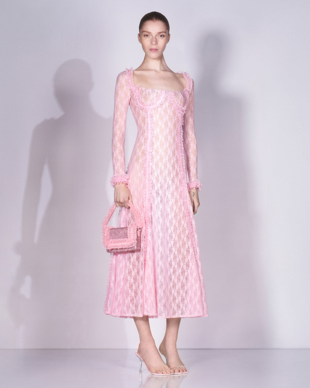 Pink Lace Ruffle Midi Dress