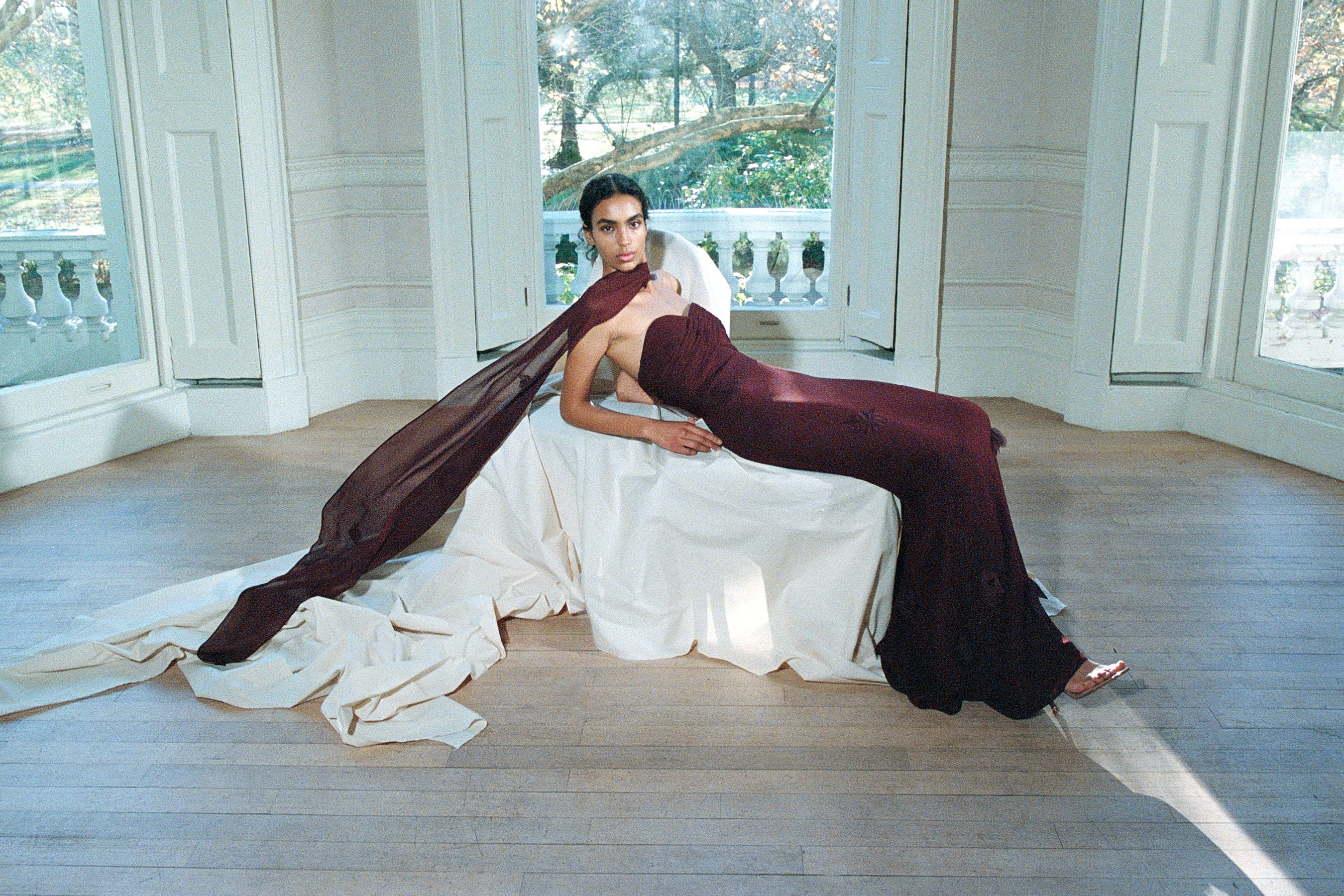 Shimmering gowns and iridescent fabrics catch the light, sculpting radiant silhouettes for glamorous affairs. Soft yet structured, precise pleats and feather trims embrace the body with intricate, sophisticated detail. New-season shapes explore fluid draping and dramatic cape accents— a modern nod to old time glamour.