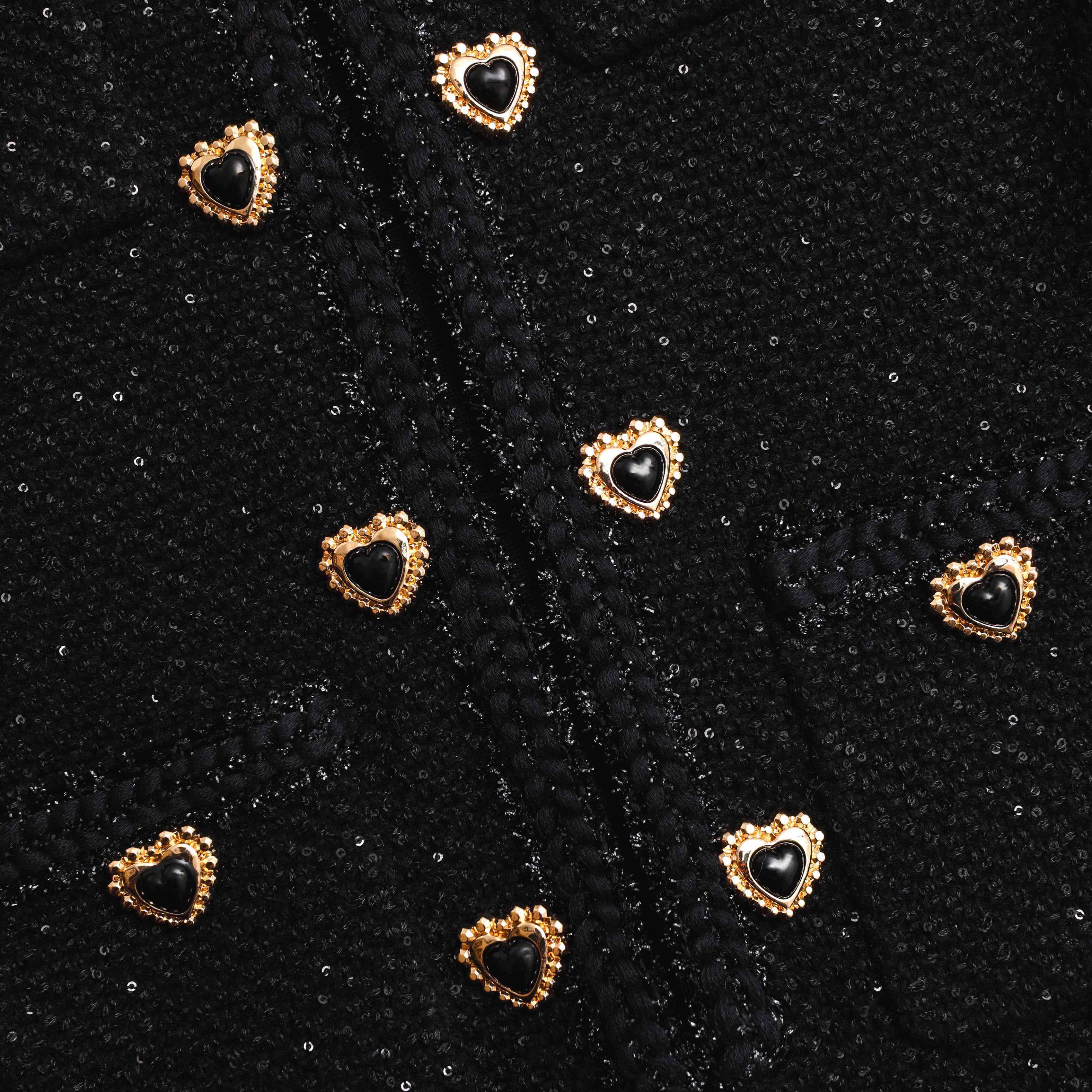 Shimmering in soft, sparkly sequinned knit, this LBD's heart-shaped buttons and pleated mini make it a frontrunner for date night dressing. Pair with our statement earrings and a glittering mini bag for additional shine.