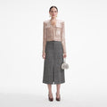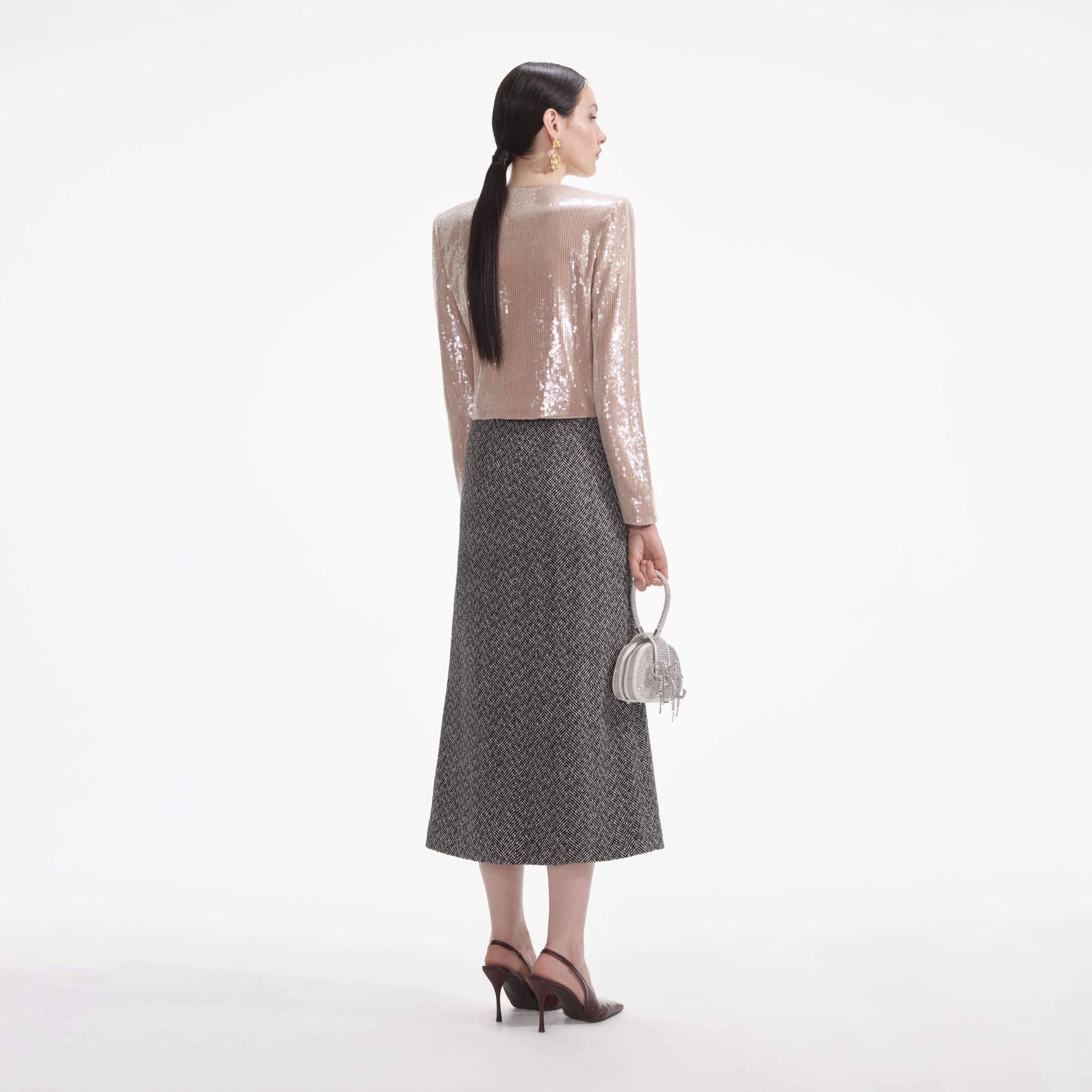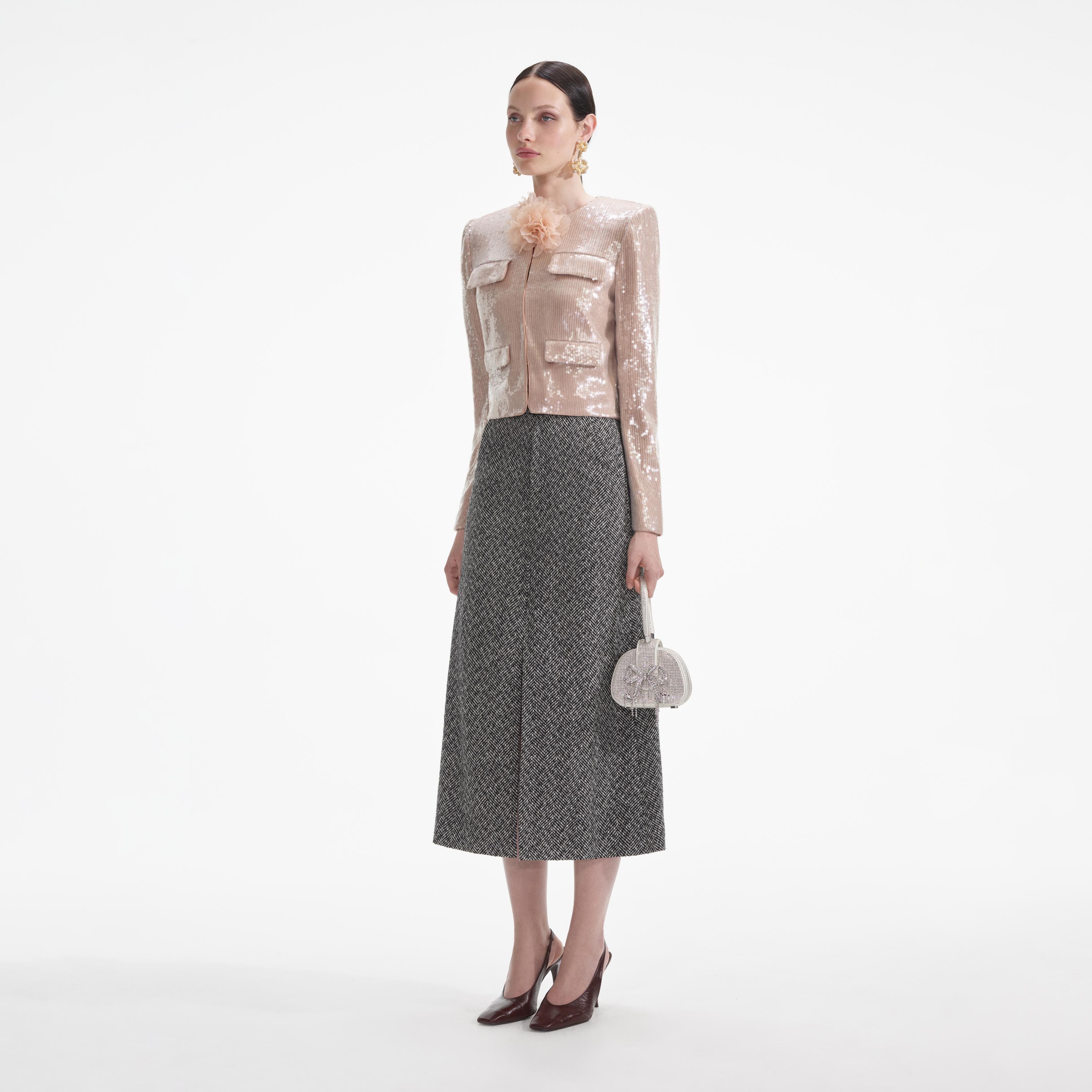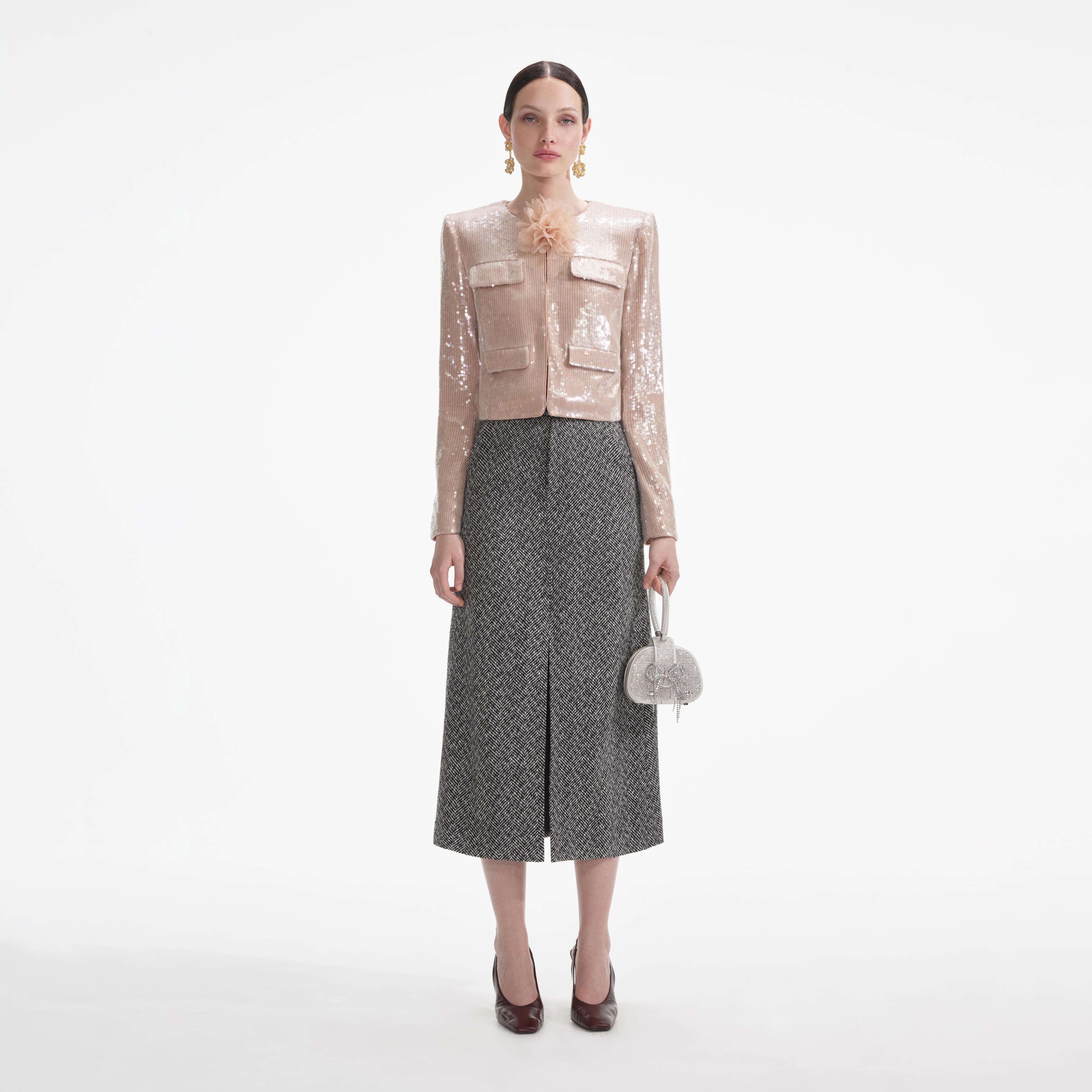 Awash in champagne sequins, this jacket is a party dresser's secret weapon. Pair its corsage-topped neckline and cropped fit with jeans or a mini. Enhance its sparkle with our statement earrings.