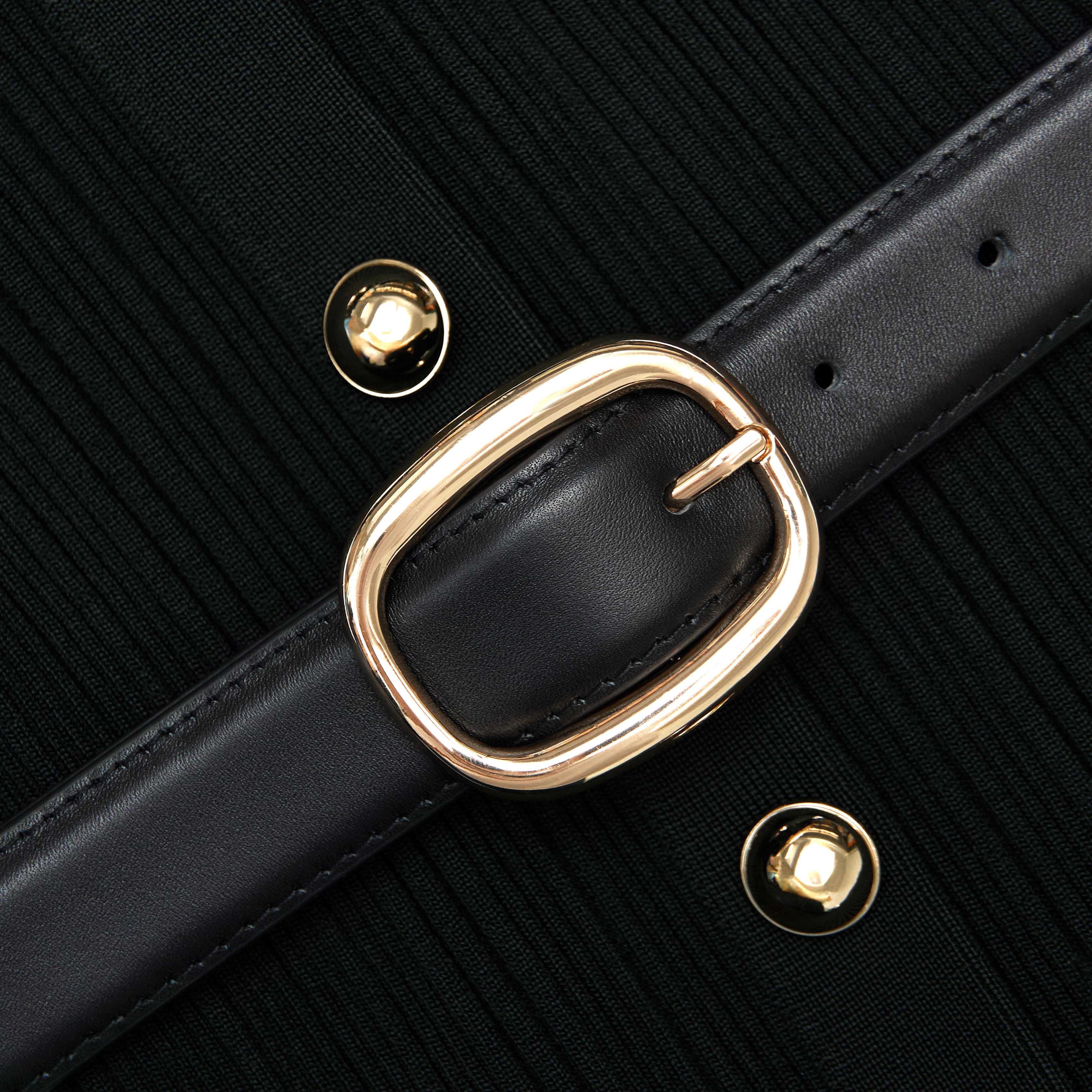 A black knit dress has never looked quite so elegant as this maxi style with its bandeau neckline, gold button detailing and dropped waistline. Wear with heels to show off its pleated flared skirt.