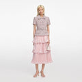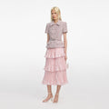 A lesson in artful contrasts, a tailored bouclé blazer meets tiered metallic pleats in this pink midi dress. Match the shine of its diamanté bow-topped belt with a pair of our statement earrings.