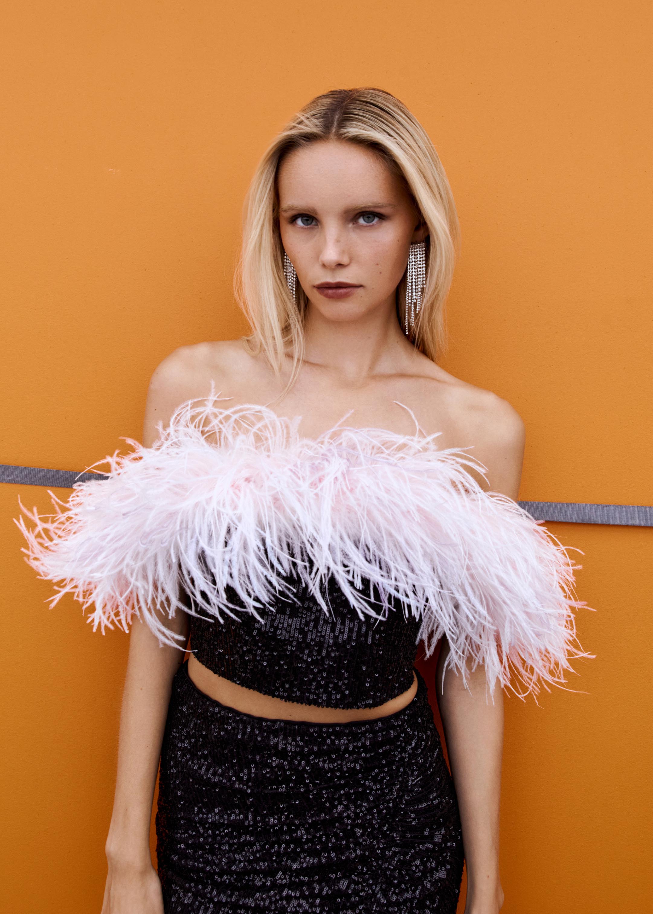 Glitzy and playful in equal measure, this top is cut from black stretch sequin for a sparkly second-skin fit. Its photogenic off-shoulder neckline stars a pink feather bustier, while a flattering cropped hem makes it the perfect match for everything from our sequinned maxi skirts to your favourite pair of jeans. Check the Size Guide to find your perfect fit.