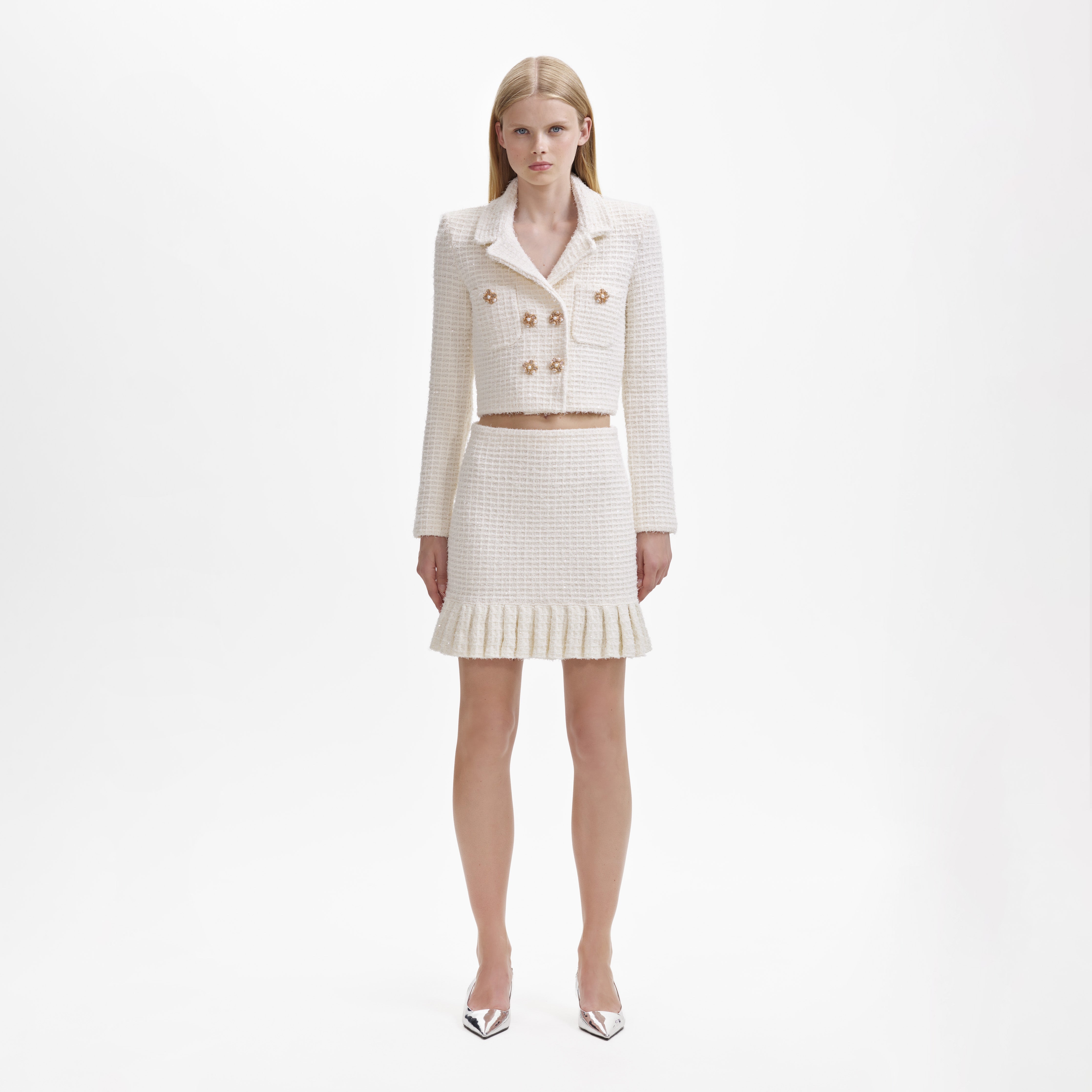 Classic yet contemporary, this mini skirt cut from cream sequin textured knit is an instant wardrobe staple. This versatile piece features a pleated hem that brings a playful kick as you wear it from desk to dinner to dancing. Pair with the matching jacket for a contemporary take on the skirt suit, or wear with a t-shirt for your off-duty look. Check the Size Guide to find your perfect fit.