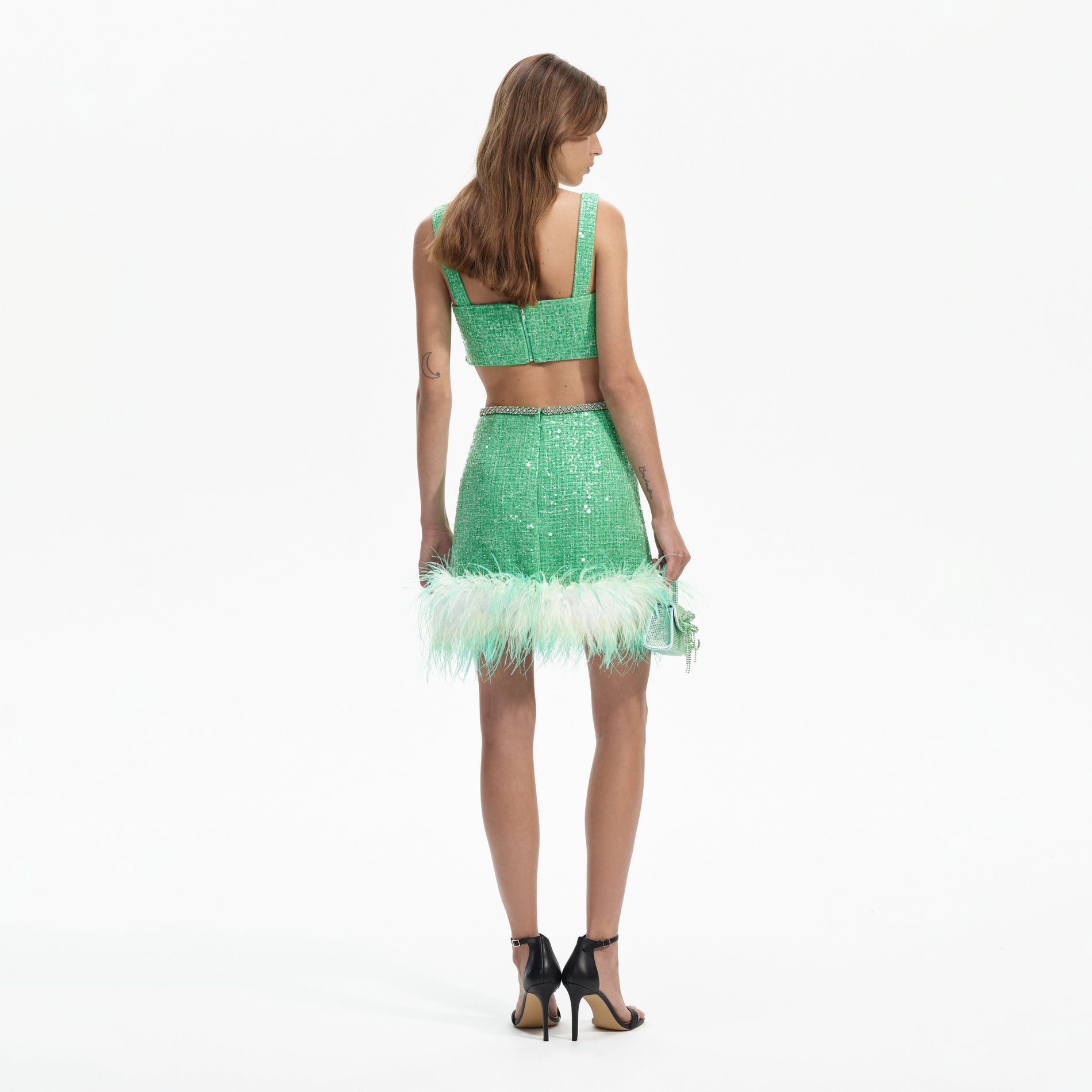 Cut from green sequinned bouclé for a structured, high-shine finish, this jacket is guaranteed to liven up even the simplest of looks. It has a boxy fit and cropped hem for effortless styling, and is lined with diamanté trim for extra sparkle. Pair it with our matching mini dress for a knockout party look few will forget. Check the Size Guide to find your perfect fit.