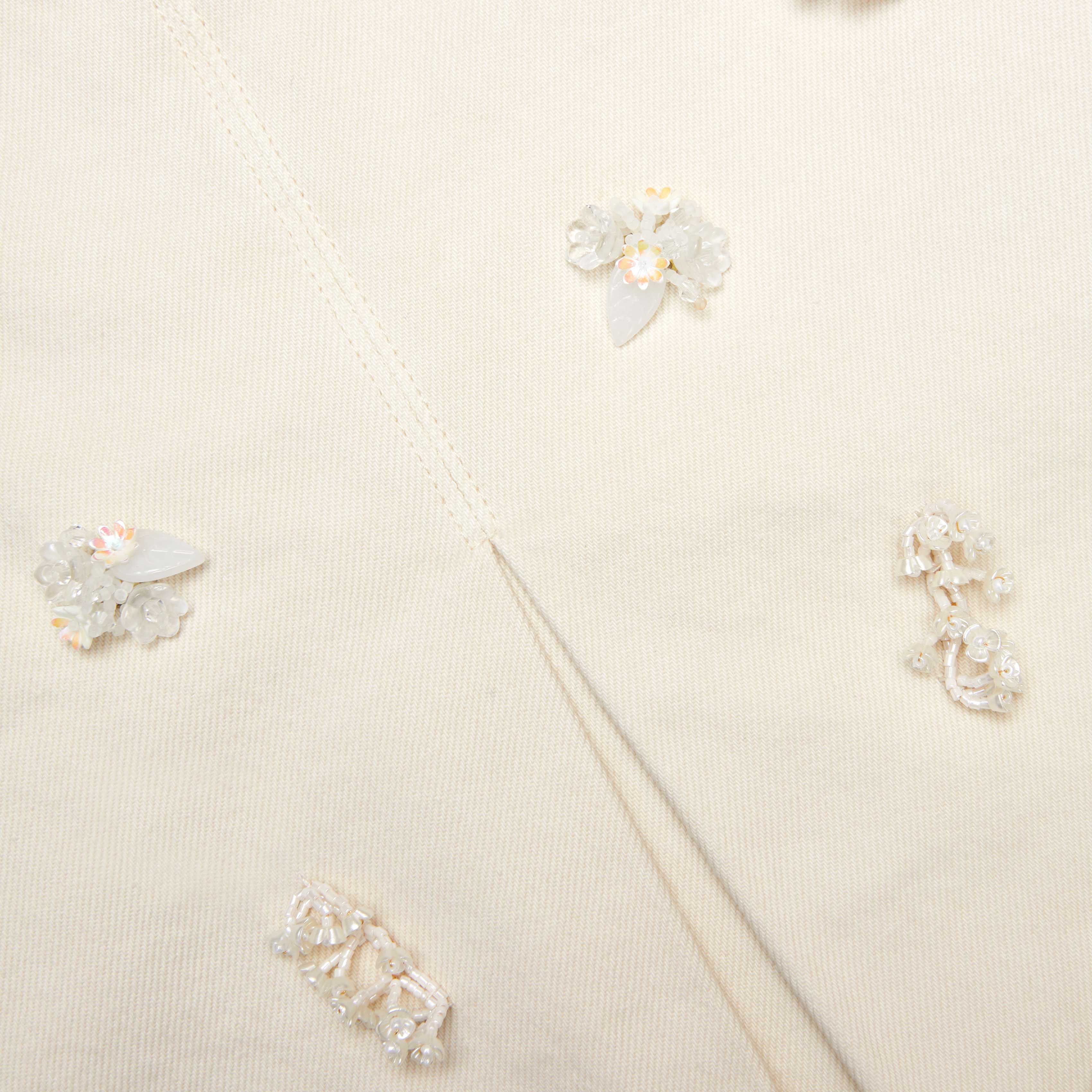 The classic denim mini gets a makeover in this cream number, accented with beaded floral designs. A front slit adds sensual detail – wear with the matching jacket for a new take on the skirt suit.