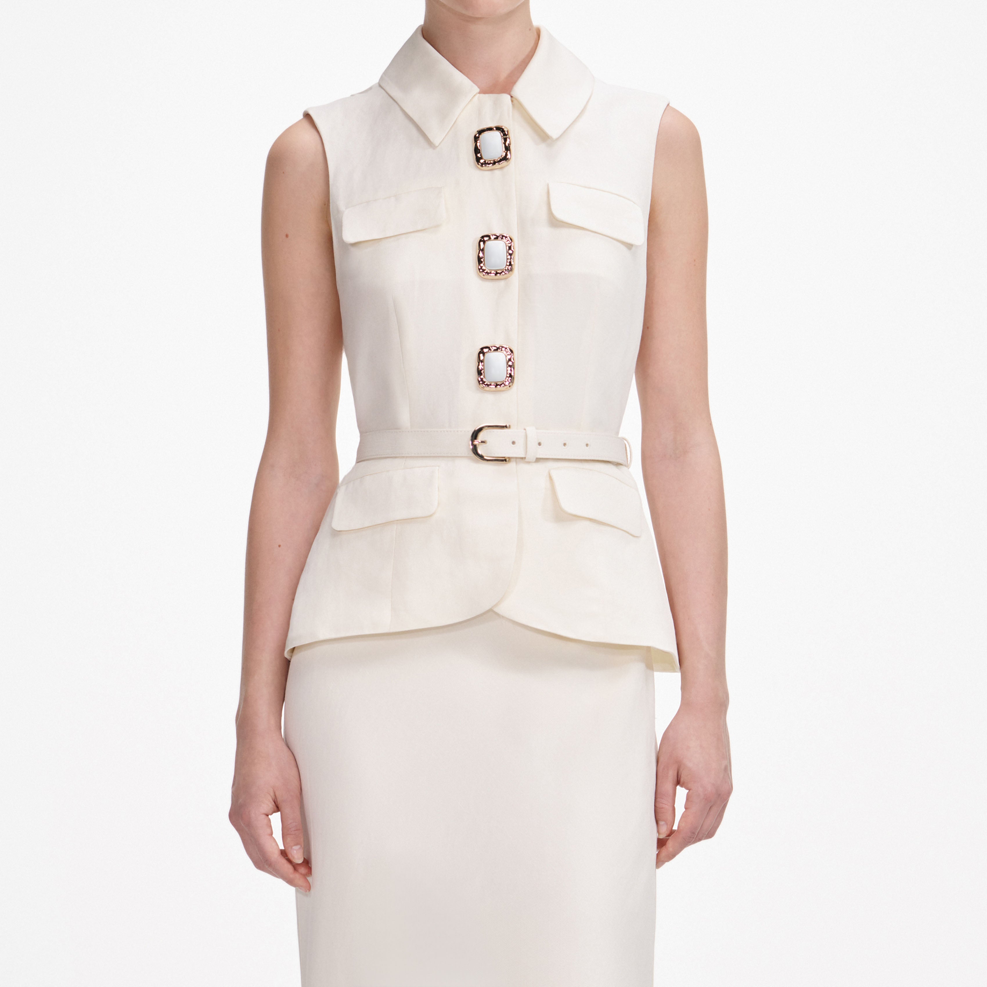 This cream linen maxi dress exudes effortless elegance. Gold & pearl buttons, a belted waist and flowing skirt accentuate it's statuesque silhouette – pair with bold jewellery for a big entrance.