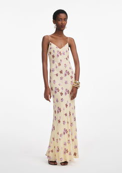 Rhinestone embellishments gives this floral print georgette maxi dress ultimate party appeal. The minimalist silhouette nods to 90s chic – style with sky-high heels for a dramatic entrance.